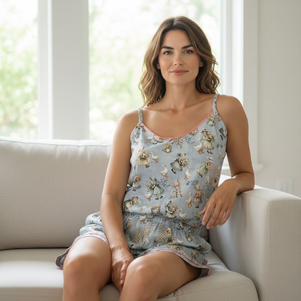 Este Pijama é confeccionado em tecido de algodão ( fibras naturais), cujo diferencial é a facilidade em adaptar-se aos mais variados climas, além de contribuir para respirabilidade da pele em contato com o tecido. Seu toque é macio, suave e sedoso.